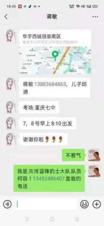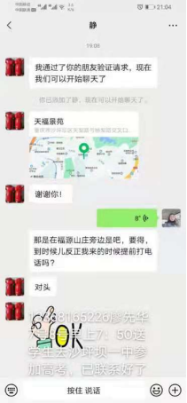 圖為隊(duì)員們提前與考生取得聯(lián)系確定送考時(shí)間及地點(diǎn)的微信截圖 每次送考,高博“雷鋒的士”大隊(duì)的隊(duì)員們都全情投入。除了保證安全舒適的用車環(huán)境,還提前做好線路規(guī)劃,并準(zhǔn)備好應(yīng)急送考方案。 6月7日,迎著初升的朝陽,千萬考生懷揣夢(mèng)想,奔赴考場(chǎng)。當(dāng)你們勇往直前為夢(mèng)想拼搏時(shí),我們將盡微薄之力,為你們的夢(mèng)想助力護(hù)航。愿你們奮筆疾書不負(fù)青春,愿我們默默守護(hù)不付社會(huì)。