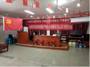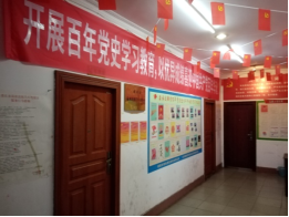 圖為公司進入大門正墻面黑板上書寫的粉筆字標語 5.支部還購買回近百米的串串小面黨旗,懸掛在學(xué)習(xí)室、過道上空、懸掛上“熱烈慶祝偉大的中國共產(chǎn)黨成立100周年”、“開展百年黨史教育學(xué)習(xí),以優(yōu)異成績喜迎百年華誕條幅”等紅底白字宣傳條幅和“泉承黨支部慶祝建黨100周年新黨員入黨宣誓、老黨員重溫誓詞黨員大會”會標;懸掛上嶄新的4號黨旗,使整個學(xué)習(xí)室、過道、樓道喜迎百年黨慶活動的氛圍莊重、紅色、濃厚、熱烈,喜慶,使泉承黨支部開展喜迎百年黨慶活動的氛圍達到了濃厚、熱烈的氛圍!