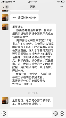 發(fā)表時(shí)間:2021-07-02 10:17作者:文/圖3 羅繼偉來(lái)源:高博 今天是個(gè)好日子,也是舉國(guó)上下翹首以待的重要日子——中國(guó)共產(chǎn)黨百年華誕。 一百年風(fēng)雨洗禮,一百年崢嶸歲月。憶往昔,風(fēng)雨兼程歲月如歌,看今朝,百年華誕風(fēng)華正茂。從一葉扁舟到巍巍巨輪,中國(guó)共產(chǎn)黨憑借頑強(qiáng)不屈的精神,始終不忘初心,牢記使命,砥礪前行。 7月1日上午8時(shí),慶祝中國(guó)共產(chǎn)黨成立100周年大會(huì)在北京天安門(mén)廣場(chǎng)隆重舉行。中共中央總書(shū)記、國(guó)家主席、中央軍委主席習(xí)近平發(fā)表重要講話(huà)。 高博客運(yùn)公司高度重視,在黨支部積極組織下,公司員工通過(guò)多種形式收看慶祝大會(huì)實(shí)況。一線工作人員通過(guò)手機(jī)、電腦實(shí)時(shí)收看,部分黨員及管理人員則組織在公司小會(huì)議室統(tǒng)一收看。