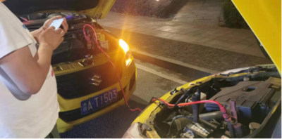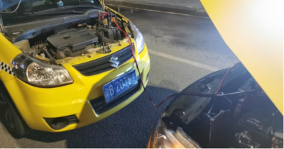 圖二 渝AT1503連接渝B20T51正負(fù) 傅師傅放緩車速并將自己所開車輛停穩(wěn),原來是“威通”公司渝B20T51出租車,于是關(guān)切地問:“師傅,怎么了,有什么需要幫助的嗎?”?!拔议_的車熄火了,怎么也打不著火,車子無法開動(dòng)了?!边@名駕駛員回答道?!坝袥]有其他辦法呢?可否推移觸燃?”傅師傅問,“剛才有幾位熱心駕駛員前來幫忙,將車推了一段距離,可還是沒有打著火?!?,傅師傅了解情況后,判斷肯定是這輛車的電瓶沒有電,于是傅師傅安慰這位年輕人“不著急哈,你在原地等一會(huì),我到附近去給你想辦法?!保祹煾甸_車找到附近汽車修理店說明情況,傅師傅自己掏出100元現(xiàn)金作為押金,借來車輛充電搭鐵線回到那輛打不著火的出租車旁,與對(duì)方出租車相對(duì)將自己的車停好,用借來的搭鐵線連接到兩車電瓶的正負(fù)極上,傅師傅先打燃自己的車輛,為那輛車充電約40分鐘后,傅師傅認(rèn)為可以打開電源開關(guān),便幫助這位年輕駕駛員打燃了車輛。