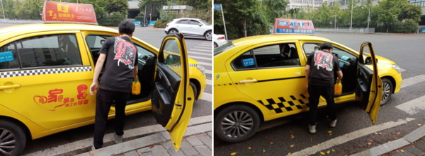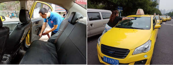 圖為公司領(lǐng)導(dǎo)正在對出租汽車進(jìn)行疫情消毒。
