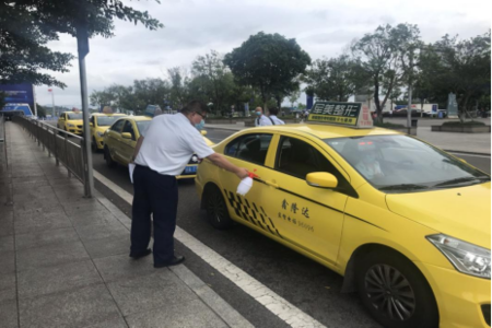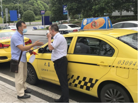 圖三 現(xiàn)場督查駕駛員防疫工作 調(diào)平時營運服務(wù)好、無事故、無投訴,且都接種了新冠疫苗的黨員、“雷鋒的士”駕駛員擔(dān)負本次任務(wù),并結(jié)合日常管理考核情況,選派100臺內(nèi)飾衛(wèi)生、車容車貌及安全性能良好的啟悅、新能源電動汽車前往悅來國博會展中心擔(dān)負接送參會嘉賓,將具體任務(wù)進行細化、分解落實到每一臺車輛和駕駛員。任務(wù)前,各任務(wù)人員對認真對所屬車輛進行徹底清洗、消毒和安全性能檢查,及時消除安全隱患。 三、現(xiàn)場督導(dǎo),圓滿完成“兩會”服務(wù)保障任務(wù)。8月25日,鑫隆達大嘉公司任務(wù)車輛駕駛員,依據(jù)自己擔(dān)負任務(wù)時間段,嚴格按照落實公司提出的具體要求,規(guī)范著裝,他們均克服路程遠、早晚高峰易堵車等重重困難,提前做好時間上的充分準備。任務(wù)中每位駕駛員做到了出車前自測體溫,對車輛內(nèi)外進行全面消毒,營運服務(wù)中駕駛員全程佩戴口罩,主動勸導(dǎo)乘客坐后排并佩戴好口罩,主動給付乘客乘車票據(jù)并提醒乘客妥善保管根據(jù)14天。