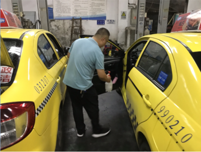 圖一 管理人員為車輛消毒 在專項(xiàng)整治檢查中,發(fā)現(xiàn)個(gè)別不合格的車輛,責(zé)令其現(xiàn)場進(jìn)行整改;對工作服破舊、設(shè)施設(shè)備不合格的立即更換,車容車貌差的立即進(jìn)行了清洗。整治現(xiàn)場不僅駕駛員主動(dòng)參與,公司的管理人員也親自動(dòng)手,幫助他們及時(shí)清洗車輛內(nèi)飾、現(xiàn)場消毒、規(guī)范車內(nèi)物品擺放。