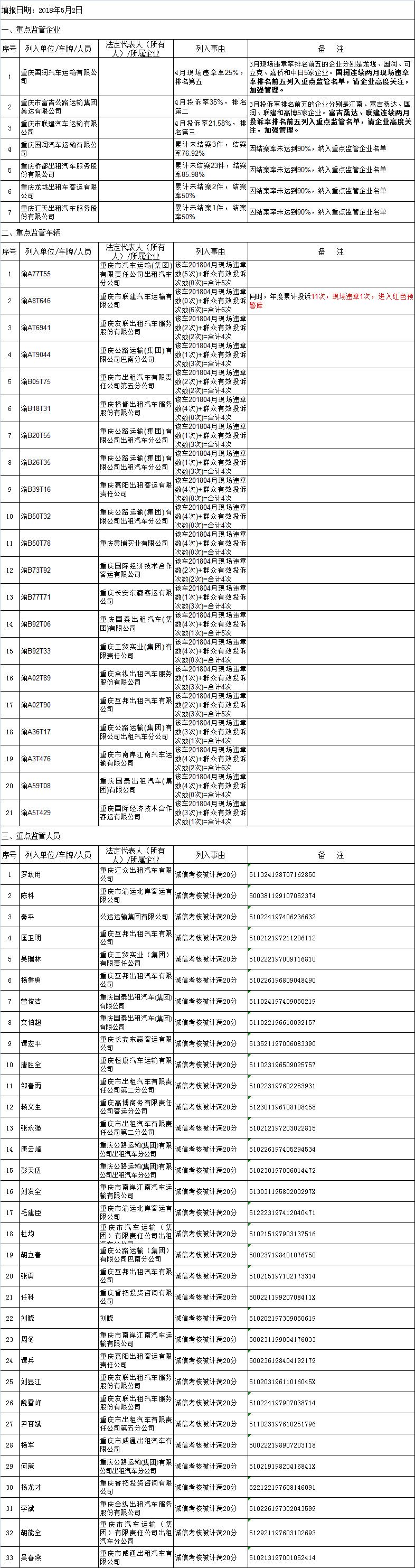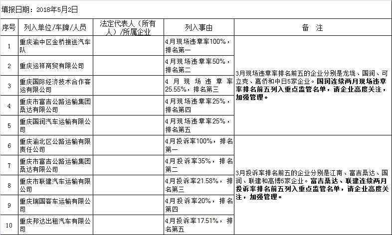 發(fā)表時(shí)間:2018-05-10 21:49 為進(jìn)一步加強(qiáng)主城區(qū)巡游出租汽車(chē)行業(yè)服務(wù)質(zhì)量監(jiān)管工作,引導(dǎo)巡游出租汽車(chē)行業(yè)健康、有序、穩(wěn)定發(fā)展,根據(jù)《主城區(qū)巡游出租汽車(chē)行業(yè)服務(wù)質(zhì)量重點(diǎn)監(jiān)管名單實(shí)施細(xì)則(試行)》 (渝交直支〔2017〕70號(hào))文件要求,重慶市交通行政執(zhí)法總隊(duì)直屬支隊(duì)對(duì)2018年4月重點(diǎn)監(jiān)管企業(yè)、重點(diǎn)監(jiān)管車(chē)輛和重點(diǎn)監(jiān)管人員名單進(jìn)行了統(tǒng)計(jì),名單如下: 一、巡游出租汽車(chē)服務(wù)質(zhì)量重點(diǎn)監(jiān)管擬定名單
