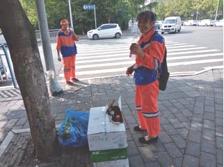 圖為倆清潔女工正在現(xiàn)場分享飲用公司為駕駛員發(fā)放的礦泉水。 (文/圖 羅國華) |