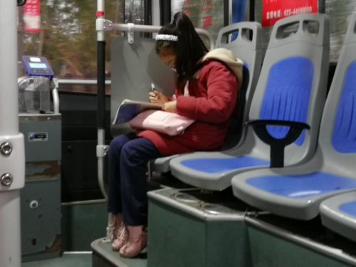 行車前檢查 11月18日18:00左右,楊勇駕駛202路公交車往潼南火車站方向行駛途中,看到車上一名小女孩踮起腳尖,雙膝托著學(xué)習(xí)資料,手里不停地寫寫畫畫。