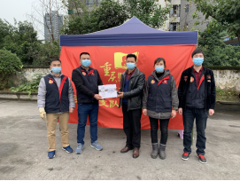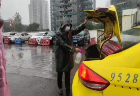 圖為:黨支部書記余波慰問正在為車輛消毒的美天雷鋒的士隊員并送上慰問品