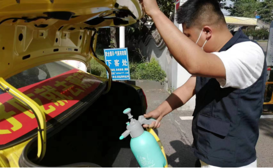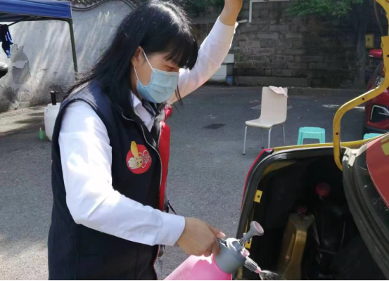 圖為“雷鋒的士”志愿者汪瓊在人和加氣站消毒點進行車輛消毒