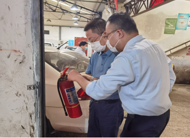 公運出租領(lǐng)導認真查看滅火器管理情況