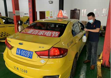 會上各支部黨員代表進行交流發(fā)言 最后,在王偉處長的帶領下,中心出租處黨員一行來到分公司出租車消毒點,手持消毒噴壺,面戴口罩,對出租汽車的門把手、方向盤、排擋桿、行李箱等重點部位進行了全面消殺,開展了一場防疫消毒志愿服務活動。
