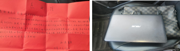 圖為失主趙先生的感謝信和失而復(fù)得的筆記本電腦