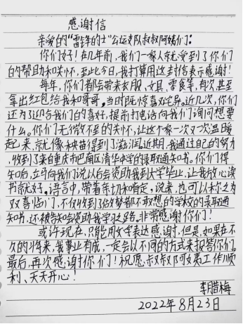 受資助學(xué)生李臘梅親筆寫下感謝信