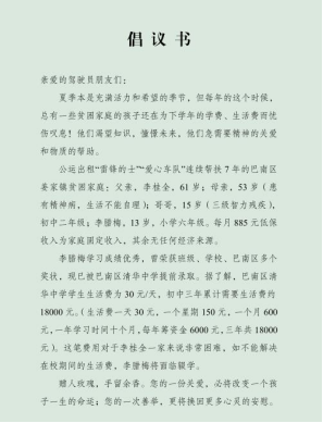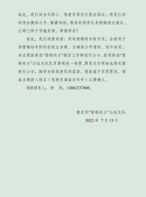 “雷鋒的士”公運支隊隊員徐偉得知后,立即將李臘梅的情況反映給公司,在分公司黨政領(lǐng)導(dǎo)的高度重視和大力支持下,“雷鋒的士”公運支隊即刻發(fā)出愛心捐款倡議書,在隊內(nèi)組織開展了“一對一”捐資助學(xué)關(guān)愛活動,呼吁全體隊員、分公司管理人員共同伸出援助之手,解囊相助,幫助李臘梅渡過難關(guān)。自活動開展以來,“雷鋒的士”公運支隊采用線上線下相結(jié)合的捐款方式,在微信群中積極宣傳,發(fā)動各隊員自愿捐款。捐款開始后,黨員隊員率先垂范、以身作則,帶頭進行愛心捐款,各隊員也積極響應(yīng),以實際行動奉獻自己的一份愛心。截至活動結(jié)束,共籌集到助學(xué)資金8836元。捐資助學(xué)關(guān)愛活動發(fā)起人徐偉表示,將把全部捐款用于李臘梅初中階段的生活費,并由專人進行保管,每月通過微信轉(zhuǎn)賬至學(xué)校賬戶,確保捐款在“陽光下”使用。
