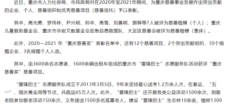 “雷鋒的士”入選重慶慈善獎(官網(wǎng)發(fā)布消息) |