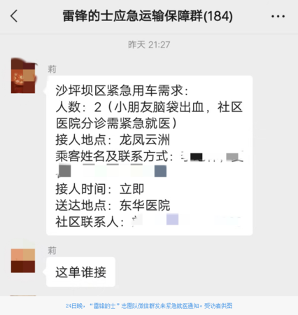 華龍網(wǎng)-新重慶客戶端訊(記者 劉艷 吳禮霜)“沙坪壩區(qū)緊急用車需求:小朋友腦袋出血,社區(qū)醫(yī)院分診需緊急就醫(yī),這單誰接?”11月24日21點(diǎn)27分,一個(gè)名為“雷鋒的士應(yīng)急運(yùn)輸保障”的微信群發(fā)來一條通知,看到該通知后,出租車師傅李飛立即接下任務(wù),趕往小朋友家。 為解決中心城區(qū)群眾應(yīng)急就醫(yī),同時(shí)接送孕產(chǎn)婦、病人的陪護(hù)人員緊急性出行等問題,11月20日,中共重慶市委宣傳部、重慶市精神文明建設(shè)委員會(huì)辦公室和市交通局共同開展“疫情要防住、文明在行動(dòng)”雷鋒的士支前工作,組建了一支“雷鋒的士”志愿服務(wù)隊(duì),重慶多名出租車司機(jī)主動(dòng)報(bào)名參加。 李飛是重慶公路運(yùn)輸集團(tuán)有限公司的一名出租車駕駛員,當(dāng)晚他正在石門大橋橋頭準(zhǔn)備回家,看到自己離乘客距離并不遠(yuǎn),他便立即接下任務(wù),駛?cè)朐训赖纛^回去接人。 受傷的小朋友今年8歲,在家不小心用刀劃破了頭?!耙姷胶⒆拥臅r(shí)候,孩子奶奶給他做了簡單包扎,孩子的狀態(tài)還好,沒哭沒鬧。但奶奶很是著急,說孩子流了很多血。”李飛說,為了不耽誤救治,他第一時(shí)間讓孩子上車,駛向最近的東華醫(yī)院。 路上,李飛一邊密切關(guān)注著孩子的狀態(tài),一邊安撫孩子和奶奶的情緒。到達(dá)醫(yī)院后,他又陪同二人去面診?!昂⒆記]有大礙,醫(yī)生給他傷口進(jìn)行了消毒包扎處理,我這才放心?!崩铒w告訴記者,由于擔(dān)心孩子和奶奶回去打不到車,傷口處理完畢后,他又將孩子和奶奶安全送回了家,還叮囑孩子近期不要碰水。來回車費(fèi),他一分沒要。他說:“不收車費(fèi)是應(yīng)該的,疫情面前應(yīng)該共渡難關(guān)。”在他看來,他所做的只不過是件小事。