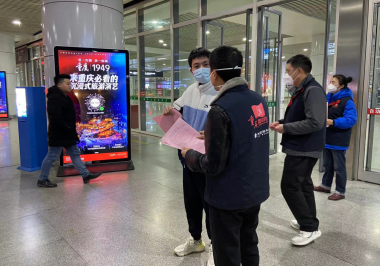 “雷鋒的士”公運(yùn)支隊(duì)隊(duì)員楊雄在重慶北站北廣場(chǎng)出站口發(fā)放防詐宣傳單