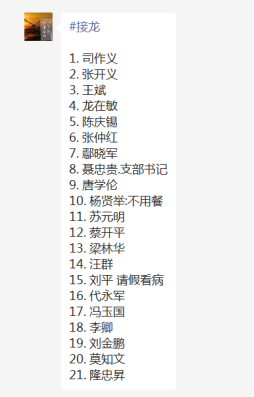 圖為微信工作群里通知發(fā)布及部分接龍 2月16日下午3點(diǎn),所有參會人員準(zhǔn)時到場,大家有序簽到進(jìn)入會場。本次學(xué)習(xí)會議高博黨支部應(yīng)到32人,實(shí)到29人,請假3人。學(xué)習(xí)會由市出協(xié)黨委管書記主持,現(xiàn)場參與“二十大”會議的我市黨代表廖財(cái)莉同志進(jìn)行了激情宣講。
