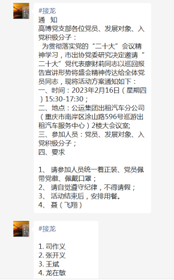 發(fā)表時間:2023-02-20 15:57作者:羅繼偉來源:高博 踏上新征程,創(chuàng)造新偉業(yè)。今年是全面貫徹落實(shí)黨的二十大精神的開局之年,奮進(jìn)新征程的時代號角已經(jīng)吹響。 尤記得去年的10月16日,舉國上下翹首以盼的二十大在北京順利召開。這是全黨全國各族人民邁上全面建設(shè)社會主義現(xiàn)代化國家新征程、向第二個百年奮斗目標(biāo)進(jìn)軍的關(guān)鍵時刻召開的一次十分重要的大會。然而,時值疫情期間,各支部只能選擇自主學(xué)習(xí)。 二月中旬,重慶出租車行業(yè)在市出協(xié)黨委的帶領(lǐng)下掀起了深入學(xué)習(xí)貫徹黨的二十大精神的熱潮。為貫徹落實(shí)黨的“二十大”精神,市出協(xié)黨委研究決定在行業(yè)內(nèi)召開專題學(xué)習(xí)會議。本次學(xué)習(xí)會將邀請我市“二十大”黨代表廖財(cái)莉同志以巡回報(bào)告宣講形式將盛會精神傳達(dá)給行業(yè)全體黨員同志,以期達(dá)到展示先進(jìn)模范榜樣、營造濃厚學(xué)習(xí)氛圍、激發(fā)黨員對黨忠誠、開啟精神交流高潮的作用。 本次宣講分兩批次進(jìn)行,分別是2月14日及2月16日,地點(diǎn)設(shè)在公運(yùn)集團(tuán)出租汽車分公司(重慶市南岸區(qū)涂山路596號巡游出租汽車服務(wù)中心)2樓大會議室。根據(jù)市出協(xié)黨委的通知,高博客運(yùn)公司將于2月16日參與學(xué)習(xí)。接到通知后,高博公司黨支部高度重視,支部聶書記立即組織支部委員召開會議,明確會議要求,落實(shí)推進(jìn)細(xì)則。會后,聶書記親自起草參會通知,并分別在高博黨員工作群、發(fā)展對象工作群及入黨積極分子工作群中發(fā)布通知,號召大家珍惜這次難得的學(xué)習(xí)機(jī)會,積極接龍參與,非不可抗力因素不得請假。接到通知后,高博黨支部全體黨員、發(fā)展對象、入黨積極分子快速響應(yīng),群內(nèi)接龍接連不斷。