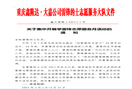 發(fā)表時(shí)間:2023-04-03 14:51作者:鐘秀蘭來(lái)源:鑫隆達(dá) 2023年3月5日是第60個(gè)“學(xué)雷鋒紀(jì)念日”,是我市貫徹《重慶市文明行為促進(jìn)條例》宣傳活動(dòng)月,為貫徹落實(shí)十九屆五中全會(huì)精神,積極響應(yīng)習(xí)近平總書(shū)記“雷鋒精神,人人可學(xué);奉獻(xiàn)愛(ài)心,處處可為”的號(hào)召,鑫隆達(dá).大嘉公司聯(lián)合黨支部結(jié)合重慶雷鋒的士志愿服務(wù)隊(duì)【重雷服【2023】3號(hào)文件《關(guān)于集中開(kāi)展學(xué)雷鋒志愿服務(wù)月活動(dòng)的通知》】的相關(guān)要求,于3月1日在企業(yè)學(xué)習(xí)群發(fā)布了三月“關(guān)于開(kāi)展學(xué)雷鋒樹(shù)新風(fēng)志愿服務(wù)活動(dòng)的通知”。