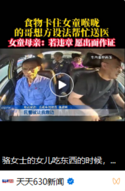 發(fā)表時間:2023-04-11 14:29作者:公運來源:公運 2023年4月3日,《天天630新聞》報道了一則“食物卡住女童喉嚨,的哥想法設法幫忙送醫(yī)”的感人事件。 通過新聞播報,我們清晰的了解到,在2023年4月1日,駱女士6歲的女兒在爺爺奶奶家被食物卡住喉嚨,駱女士發(fā)現(xiàn)后立即用海姆里克手法進行了急救,但女兒痛苦難受的哭鬧,讓駱女士擔心害怕,決定立馬送往北碚九院進行就醫(yī)。爺爺、奶奶陪同駱女士抱著6歲女兒一路輾轉(zhuǎn)最終坐上了公運出租的哥張建林的車,當時正是晚高峰時間,去往北碚九院的道路比較擁堵,情急之下,的哥張建林做了大膽的決定,變道逆行向九院的方向行使,駱女士感動又緊張的說:“師傅,你這樣要遭扣分怎么得了?”的哥張建林說:“現(xiàn)在每一分每一秒對娃兒來說太重要,要抓緊時間把娃送到醫(yī)院?!痹跔幏謯Z秒的違章行駛中,的哥張建林被交警攔下,的哥張建林探出頭向交警解釋:“娃兒被東西卡喉嚨,要趕快送醫(yī)院,生命第一位?!苯痪吹杰噧?nèi)心急火燎的一家人,伸手一揮:“跟我走?!苯痪T摩托車在前面為的哥張建林開道,為女童就醫(yī)贏得了寶貴的時間。 事后,駱女士想通過《天天630新聞》好好感謝一下熱心的哥張建林,并表示此事給張師傅增添了很多的麻煩,如果張師傅因此受到處罰,她愿意全力配合,幫張師傅出面作“違章”證明。 所以,就有了2023年4月3日的新聞片段。的哥張建林今年52歲,是“公運出租”一位老的哥,張建林對電話采訪的記者表示說:“當時沒有多想,只想爭分奪秒,能這么快把娃兒送到醫(yī)院,還多虧了交警的幫忙開道,換成任何一位的哥都會和我一樣的做法?!焙唵蔚幕卮?,體現(xiàn)了的哥張建林的真誠善良;新聞的播報,體現(xiàn)了駱女士的知恩報恩;他們用實際行動傳播著溫暖和善意。 善良,就是你我間的正能量,它由愛而生,在社會中傳遞,溫暖了別人,最終也會溫暖在你自己的身上。“公運出租”將繼續(xù)著力發(fā)掘宣廣巡游出租汽車駕駛員隊伍中的正能量,進一步擦亮“公運出租”良好社會形象,為巡游出租汽車高質(zhì)量發(fā)展、為和諧社會建設貢獻力量。