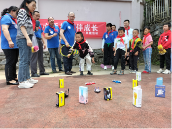 圖為美天支隊與荊竹村學(xué)校學(xué)生們進(jìn)行套圈游戲