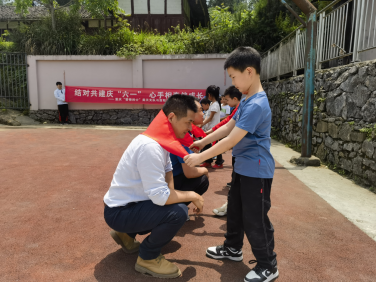 圖為荊竹村學(xué)校學(xué)生為大家戴上紅領(lǐng)巾