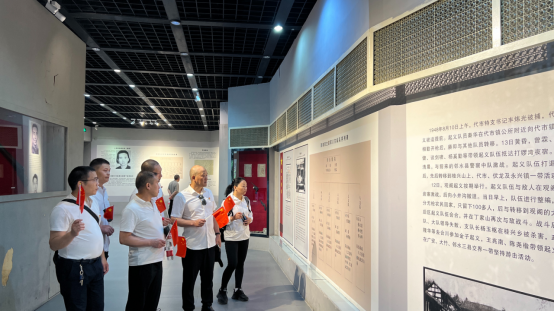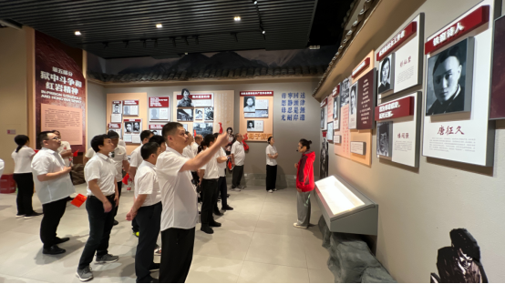 圖為黨支部聶書記(右二)帶領(lǐng)大家認(rèn)真學(xué)習(xí)先輩事跡 走出紀(jì)念館,在高博黨支部組織委員鄢曉軍的帶領(lǐng)下,我們在先烈們的群像前集結(jié),面對鮮紅的黨旗,重溫入黨誓詞。
