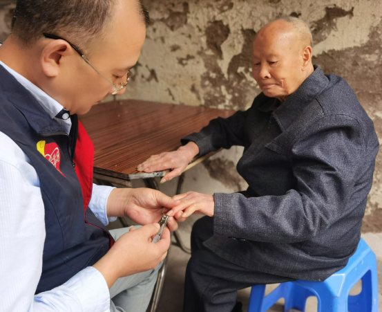 圖為:雷鋒車隊隊員黃興平為老人剪指甲