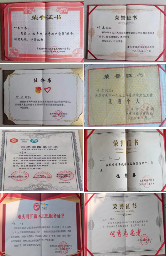 獲得的榮譽: 2018年被重慶兩江新區(qū)星系列樓宇委員會評為2018年度“優(yōu)秀共產(chǎn)黨員”稱號 2018年12月在2018年度人民防空志愿者渝北區(qū)支隊的志愿服務工作中,積極奉獻,表現(xiàn)優(yōu)秀,重慶市渝北區(qū)民防辦公室頒發(fā)了榮譽證書。 2018年10月在重慶市青年志愿者協(xié)會第四次會員大會選舉通過,當選為重慶市青年志愿者協(xié)會第四屆理事會理事。重慶市青年志愿者協(xié)會頒發(fā)了任命書。 2020年4月在新冠肺炎疫情期間,作為青年志愿者參與了兩江新區(qū)藍天雪豹防疫檢查志愿服務青年突擊隊,并在此過程中提供專業(yè)志愿服務,以實際行動踐行了“奉獻、友愛、互助、進步”的志愿精神,無私奉獻,被兩江新區(qū)團工委、共青團星系列樓宇委員會,兩江新區(qū)藍天雪豹志愿者服務隊頒發(fā)了志愿者服務證書。 2022年11月至2023年1月分別參加疫情防控志愿者服務,表現(xiàn)突出兩江新區(qū)為葉未頒發(fā)了服務證書、萬年路社區(qū)為葉未頒發(fā)優(yōu)秀志愿者證書 2023年4月雷鋒的士成立十周年被總隊評為“優(yōu)秀雷鋒隊員” 葉未同志2021年3月加入重慶泉承出租汽車有限公司。是泉承公司“雷鋒的士”創(chuàng)建車輛優(yōu)秀雷鋒隊員也是支部黨員。他是一個很熱心的人,也是一個很善良的人。他的熱心,他的善良,時常讓乘客感到溫暖。他來到泉承公司前,曾參加過藍天救援隊、預備役、重慶交通廣播愛心車隊、重慶人民防空志愿者服務隊、重慶市山城雪豹志愿者服務隊,2017年二月參加了四川均連地震救援(為期一周),2023年4月,他參加重慶半程馬拉松志愿者,保障賽程安全平穩(wěn)進行。同年7月,潼南發(fā)生特大暴雨,他受上級團市委指派,作為“山城雪豹”志愿者隊員,加入到為期二天的抗洪搶險救災任務中去,并圓滿的完成了此次任務為,得到了團市委和人民群眾的點贊好評。在他駕駛雷鋒的士的同時,都會利用自己空余的時間參加到各種公益活動中去,做一些力所能及,且有意義的事情,同時,在營運途中,他也經(jīng)常幫助到需要幫助的人。哪里需要他,他就會出現(xiàn)在哪里。葉未還是一名當過兵的退伍軍人,無論從思想政治,作風紀律方面,他都以高標準,高覺悟的思想理念,去要求自己,時刻以一名軍人黨員、雷鋒的士隊員的身份,做好自己的本職工作。 以下為葉未好人好事的典型事跡: 泉承黨員雷鋒車助人為樂 2022年7月12號下午六點左右,葉未同志,駕駛著星級“雷鋒的士”創(chuàng)建車輛巡游時,在平臺上接了一個大渡口區(qū)政府去往南坪四公里的網(wǎng)約訂單。 在去接該乘客的時候,看到馬路邊上,一男子帶著一個小女孩在公路邊很著急,一邊向他揮手,一邊不停的摸著小女孩的頭,葉未便立即靠邊停車,打開車窗問他怎么回事兒?他說那個小女孩是他女兒,現(xiàn)在發(fā)高燒,都已經(jīng)超過40度了,麻煩送他們倆去醫(yī)院。葉未說沒問題,你們趕快上車吧! 這時候,離網(wǎng)約訂單約定的時間也馬上要到了,地點也差不多50米左右,于是葉未又將車開到訂單約定點,告訴該乘客,現(xiàn)在急需送一位病人去醫(yī)院,沒辦法接她去她的目的地了,這邊把訂單取消,讓她重新打車。乘客聽后,也非常愿意的同意了,說完便對乘客表示了感謝,便飛快的將車上小女孩和她父親送到了大渡口重鋼醫(yī)院。 車剛停穩(wěn),葉未就對男子說“你不用付車費,抓緊時間把小女孩送去就醫(yī)吧”!男子帶著他女兒連聲道謝后,帶著女兒往醫(yī)院的急診室走去,看著他們離去的背影,葉未的心里感到非常的欣慰。 疫情防控人人有責,雷鋒精神無處不在 在2022年8月18日19點30分起,重慶沙坪壩區(qū)東部城區(qū)因疫情嚴峻被臨時管控,葉未因搭在乘客被困其中,他第一時間沒有想到找公司的麻煩,而是作為黨員的他,第一時間申請進入天星橋街道參與防疫愿服務,主要服務任務為下沉點位協(xié)助開展疫情防控工作。由于葉未做事,認真,葉未所在的這個點位分了幾個組,街道讓他擔任其中一個組的組長,連同他在內(nèi)共九人,八人都由葉未安排他們具體工作。待疫情被控制住后,才離開。 重慶從11月1日以來,疫情死灰復燃,蔓延的苗頭陸續(xù)展開來,遍布了好多區(qū)縣,主城區(qū)的疫情是大家最為觀注的焦點。好多居民樓,小區(qū),社區(qū)都開始一一管控、封閉、整個城市都開始靜了下來。 黨員葉未同志,通過各種渠道了解和看到重慶這幾天疫情越來越嚴重,為了能夠戰(zhàn)勝疫情,能夠在疫情期間發(fā)揮自己的力量。能夠為醫(yī)護工作者和受核酸采集的人們做一點貢獻,獻上自己的一份愛心。11月12日,天還沒亮,一大早就起來,主動打電話給所在渝北區(qū)人和街道萬年路社區(qū),要求加入抗疫志愿者隊伍中去,在收到社區(qū)主任的同意后,葉未如愿的參加了疫區(qū)的各項工作任務。直到疫情結(jié)束后,才離開。 為保障因病需要就醫(yī)的群眾。11月于15日下發(fā)了關于號召行業(yè)內(nèi)黨員駕駛員“雷鋒的士”隊員及退役軍人駕駛員參加防疫志愿服務活動的通知,16日重慶市雷鋒的士志愿服務隊關于轉(zhuǎn)發(fā)《出租汽車應急運輸保障服務隊告知書》的通知,重慶市道運輸事務中心經(jīng)多方協(xié)調(diào),21日為 “雷鋒的士”隊員開具了小區(qū)出入證明和電子通行證,以此來保障中心城區(qū)出租汽車應