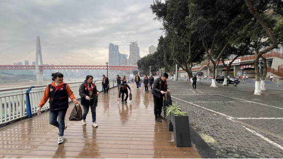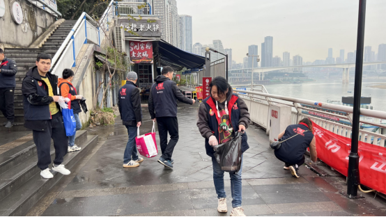 發(fā)表時(shí)間:2024-03-18 14:29作者:羅繼偉來(lái)源:高博 山水之城,美食之都。重慶——一個(gè)年輕、時(shí)尚的城市,既有著獨(dú)特的地貌風(fēng)景,醉人的美食文化,也蘊(yùn)含著悠久的歷史和豐富的文化底蘊(yùn)。一方山水養(yǎng)一方人,重慶獨(dú)有的地域特色,培養(yǎng)了重慶人民豪邁的性格,同時(shí)也賦予了這座城市包容的特性,多元文化和諧發(fā)展。越來(lái)越多的游客來(lái)到重慶打卡游覽,重慶一躍成為炙手可熱的網(wǎng)紅城市。 為展示城市文明形象,也為保護(hù)環(huán)境,共筑美麗重慶,高博雷鋒的士大隊(duì)深入開(kāi)展保護(hù)環(huán)境清撿垃圾活動(dòng)。本次活動(dòng)主題為:保護(hù)母親河,高博在行動(dòng)?;顒?dòng)地點(diǎn)選在網(wǎng)紅景點(diǎn)——洪崖洞濱江沿線。 3月12日下午2點(diǎn),來(lái)自高博客運(yùn)的10名雷鋒的士及黨員志愿者準(zhǔn)時(shí)在洪崖洞觀景平臺(tái)集結(jié)。工會(huì)羅主席、黨支部聶書(shū)記、客運(yùn)宋經(jīng)理親自參與。簡(jiǎn)單的啟動(dòng)儀式后,隊(duì)員們統(tǒng)一佩戴手套,手持垃圾袋,對(duì)散落在濱江沿線人行步道上的垃圾進(jìn)行全面清理。接著,隊(duì)員們沿著臺(tái)階下到碼頭河邊,進(jìn)一步清撿河道沿線的垃圾。