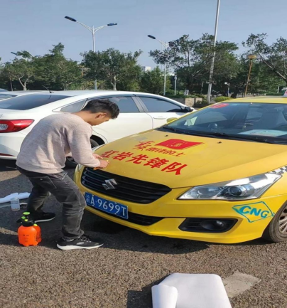 渝A9699T車粘貼紅巖先鋒隊標識和更換頂燈后的照片 |