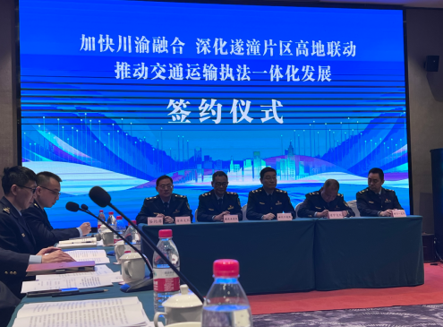 四川省交通運(yùn)輸綜合行政執(zhí)法總隊(duì)第三支隊(duì)黨委書記李宏軍致辭,副書記何清華就《加快川渝融合深化遂潼片區(qū)高地聯(lián)動(dòng)推動(dòng)交通運(yùn)輸執(zhí)法一體化發(fā)展實(shí)施方案》進(jìn)行解讀;參加人員就“推動(dòng)川渝兩地遂潼片區(qū)交通運(yùn)輸執(zhí)法一體化發(fā)展”交流討論;川渝遂潼片區(qū)多方簽署了交通運(yùn)輸執(zhí)法一體化發(fā)展工作協(xié)議。