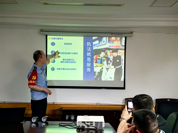 為構(gòu)建良好的隊(duì)企關(guān)系,進(jìn)一步增強(qiáng)從業(yè)人員的法制意識(shí),達(dá)到有效控制服務(wù)質(zhì)量投訴的目的,4月17日下午,重慶交通行政綜合執(zhí)法直屬支隊(duì)臨時(shí)黨支部普法先鋒隊(duì)會(huì)同我司開展了普法宣講活動(dòng)。普法先鋒隊(duì)王耀中隊(duì)長以《擦亮窗口待客來》為主題,對我司重點(diǎn)車輛責(zé)任人和部分駕駛員代表進(jìn)行普法說理宣講。