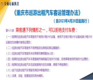一、數(shù)據(jù)通報(bào) 通過幻燈片,展示了直屬支隊(duì)巡游出租汽車投訴工單類別分類統(tǒng)計(jì)表、一季度拒載高發(fā)區(qū)域統(tǒng)計(jì)、2024年第一季度拒載投訴各時(shí)段分布表、2024年第一季度百車以上巡游出租汽車投訴率前五企業(yè)、共查獲違法亂象216件、攻堅(jiān)行動(dòng)第一階段數(shù)據(jù)公司情況、公司自律措施、重點(diǎn)車輛人員、各類違法違規(guī)行為查處分布圖、攻堅(jiān)行動(dòng)第一階段違法亂象區(qū)域分布等。 二、典型違法亂象行為案例 宣講員,分幾個(gè)步驟為大家講解亂象案例。1、軌跡。執(zhí)法部門可通過軌跡查獲違法違規(guī)車輛。尤其是渝中區(qū)轉(zhuǎn)花車,拉客吃回扣問題嚴(yán)重,駕駛員們的行駛軌跡,都在執(zhí)法部門管控中,可以通過監(jiān)控系統(tǒng)實(shí)時(shí)查詢,實(shí)時(shí)處罰。在宣講的同時(shí),為駕駛員們播放軌跡圖,讓其知道有跡可尋,需認(rèn)清現(xiàn)實(shí),杜絕違法。2、拒載。拒載是目前投訴第三名。許多駕駛員以等客、不走為由實(shí)行花式拒載,多次拒絕乘客上車,只為等到自己心儀的乘客。此行為嚴(yán)重引起乘客的不滿,增加乘客投訴率,同時(shí)此類駕駛員在行業(yè)里成為了不好的反面教材,為行業(yè)抹黑。在此,并提醒駕駛員們,等人就打暫停燈,空車燈的情況下,決對(duì)不允許不載客。3、危險(xiǎn)駕駛。駕駛員在開車途中雙手離開方向盤,玩手機(jī),嚴(yán)重影響駕駛安全,為乘客的生命安全帶來危險(xiǎn)因素。請(qǐng)駕駛員們?cè)诳词謾C(jī)時(shí),一定要停下車來,待看完后,再行駛。堅(jiān)決杜絕開車刷視頻,看小說,打麻將,刷微信的情況發(fā)生。以免招來乘客的投訴和影響車內(nèi)人員安全。4、超載、推銷套票。通過案例為駕駛員分享,因線上篩查,查到該車無駕駛員打卡信息,并順著線索抽查了該車前半小時(shí)視頻監(jiān)控,查到車輛超載行為。并且該車駕駛員用各種方式方法向乘客推銷套票、景點(diǎn),嚴(yán)重破壞行業(yè)風(fēng)氣。5、欺騙乘客。外地游客要求去索道游玩,駕駛員以索道停運(yùn)為由,惡意欺騙乘客,更換地點(diǎn),以此達(dá)到自己不可告人的目的。 三、常見違規(guī)行為相關(guān)法律法規(guī)知識(shí) 宣講員為駕駛員分享巡游出租汽車主要違法行為列表。1、在未開啟空車標(biāo)志的情況下攬客2、開啟空車標(biāo)志時(shí)拒載3、接受巡游出租汽車電召任務(wù)后未履行約定的4、以預(yù)設(shè)目的地的方式從事定線運(yùn)輸5、故意繞道行駛6、未經(jīng)乘客同意擅自變更乘客指定的行駛路線7、巡游出租汽車駕駛員不按照規(guī)定使用計(jì)程計(jì)價(jià)設(shè)備 8、巡游出租汽車駕駛員違規(guī)收費(fèi)10、未經(jīng)乘客同意,搭載其他乘客11、途中甩客。以上違法行為都將被處以200元-500元罰款。 四、常見駕乘矛盾糾紛處置技巧 宣講員為駕駛員分享了繞道投訴原因分析、不文明服務(wù)投訴原因分析、拒載投訴原因分析。并且為大家進(jìn)行逐一講解。作為一個(gè)有從業(yè)資格證的主城區(qū)駕駛員,在搭載乘客后,選路時(shí),一是要選擇距離最短、費(fèi)用最低的路線。在規(guī)劃路線時(shí),如遇走近路要堵車,走遠(yuǎn)路要快,但相對(duì)路程遠(yuǎn),費(fèi)用也一定會(huì)高,一定要征得乘客同意,才能有效避免投訴成立。二是要遵循乘客意見,按照乘客要求行駛。三是運(yùn)營中遇交通堵塞、道路臨時(shí)封閉等,需改變?cè)旭偮肪€時(shí),需征得乘客同意,并說明原因,如果有相關(guān)部門下發(fā)的資料,可讓乘客了解,或者讓其撥打公司及執(zhí)法部門電話核實(shí)。目前,很多無中生有的投訴,其中有部分網(wǎng)約車、私家車因?yàn)楸粨趸蛘卟翏斓惹闆r來投訴駕駛員。所以駕駛員還應(yīng)保持監(jiān)控正常運(yùn)轉(zhuǎn),并處于正常錄相范圍,在發(fā)生問題時(shí),可及時(shí)調(diào)取,以此來維護(hù)自身合法權(quán)力。