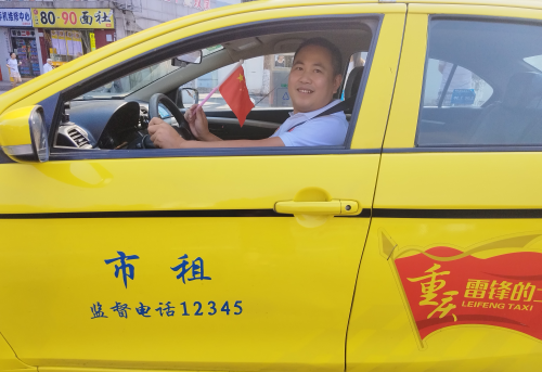 國慶一早,萬開田比平時早起了一些。他仔細(xì)地打理完著裝,在車上裝飾了兩面早已準(zhǔn)備好的五星紅旗,從渝北出發(fā),開始了一天的工作。今年49歲的萬開田,2000年入行成為“的哥”,現(xiàn)在也是重慶雷鋒的士大隊的隊員之一。每年的國慶節(jié),他基本都會出車,覺得這個日子里,總是特別愉悅。