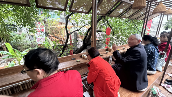 圖為雷鋒的士志愿者們與老人們在時光里圖書館前集體合影 途徑山城記憶館—相予秀閣—造創(chuàng)意空間—慈記外婆橋小食店—體心堂—臨崖棧道—山城故事館—時光里書店,我們最后抵達(dá)山城壩壩茶歇腳。在這里我們傾聽老人們對過往的回憶,也和老人們一起游戲。在全體雷鋒的士志愿者為老人們送上小小禮物和滿滿祝福后,本次重陽敬老活動圓滿結(jié)束。
