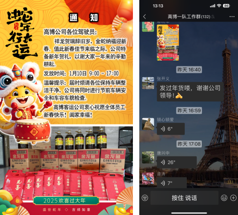 圖為高博年貨發(fā)放通知及群中駕駛員們的響應(yīng)截圖
