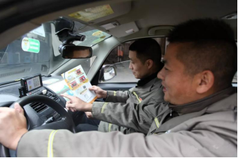 工作人員為駕駛員講解新版車載智能終端使用方法