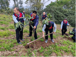 活動現(xiàn)場,身著統(tǒng)一馬甲的“雷鋒的士”隊員們,揮鍬、扶苗,提水澆灌,合力栽下近百余株的枇杷樹苗。