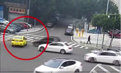 出租車不禮讓右方來車,造成人員受傷的交通事故。(視頻監(jiān)控截圖)
