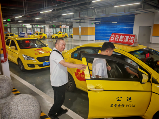 圖為:重慶出租汽車暨汽車租賃協(xié)會(huì)黨委黨務(wù)教導(dǎo)員管邦華親臨“東站夜間護(hù)航行動(dòng)”現(xiàn)場。