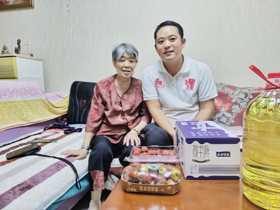 圖為:重慶美天東贏—恒康聯(lián)合黨支部黨員徐周帶著水果慰問陳澤英同志 |
