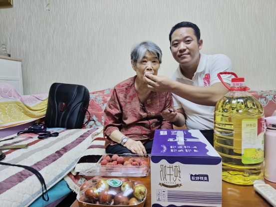 圖為:重慶美天東贏—恒康聯(lián)合黨支部黨員徐周親手喂婆婆吃荔枝