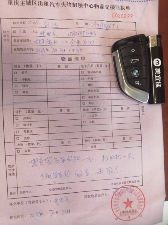圖為:公運黨小組黨員代世兵把寶馬車鑰匙交到重慶出租汽車失物招領(lǐng)中心的回執(zhí)單。 |