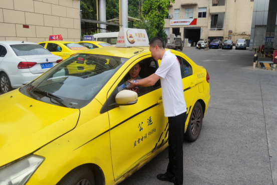 圖為:公運(yùn)黨小組黨員為廣大出租車駕駛員送防暑降溫物品。