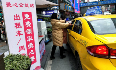 工作人員將免費午餐發(fā)放給出租車駕駛員