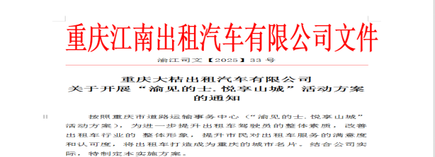 發(fā)表時間:2025-09-04 10:26作者:江南來源:江南 為積極響應重慶市道路運輸事務中心《關于印發(fā)“渝見的士?悅享山城”主題活動》的通知,落實渝道運發(fā)【2025】89號文件精神,我公司高度重視,迅速組織學習傳達,并結合企業(yè)實際制定了具體落實措施,旨在全面提升出租車駕駛員綜合素質(zhì),優(yōu)化服務質(zhì)量,塑造行業(yè)形象?,F(xiàn)將有關工作部署如下: 一、高度重視,迅速組織動員 公司成立專項工作小組,由主要負責人牽頭,各部門協(xié)同參與,明確職責分工,確保主題活動有序推進。于近日召開了動員部署會議,傳達文件精神,統(tǒng)一思想認識,強調(diào)本次活動對提升出租車行業(yè)形象、增強市民滿意度的重要意義。