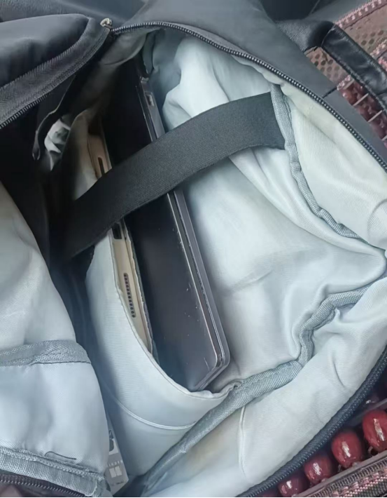 圖為:重慶“雷鋒的士·紅巖先鋒隊(duì)”公運(yùn)黨小組黨員楊健在車上拾到的雙肩包