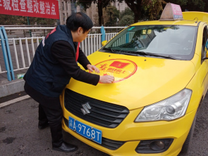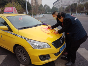 圖為王華倫同志正在為公司新增星級“雷鋒的士”創(chuàng)建車輛張貼星級標(biāo)識(shí)