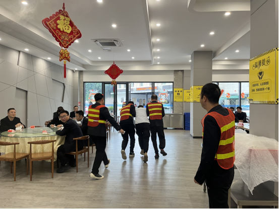 圖為:全體人員模擬綜合服務(wù)區(qū)食堂突發(fā)火情應(yīng)急疏散演練